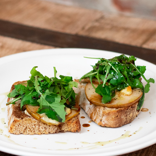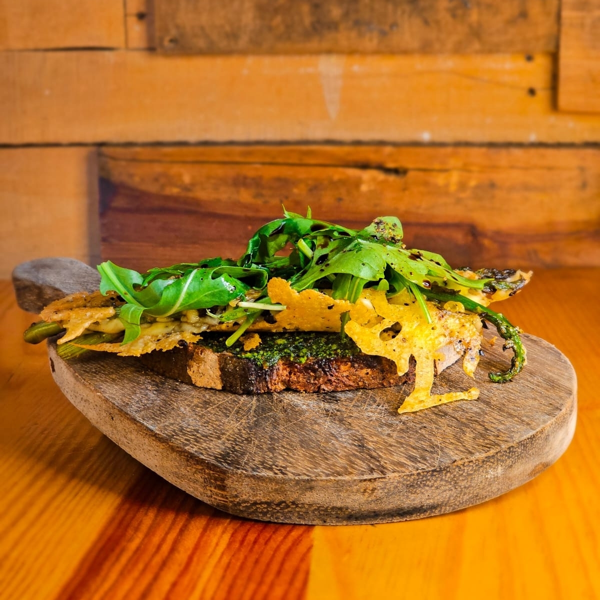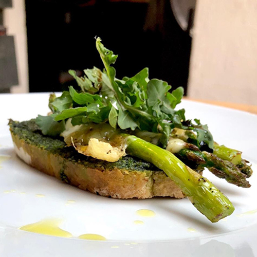 Espárragos, gruyère, arúgula, sobre pan de la casa.
