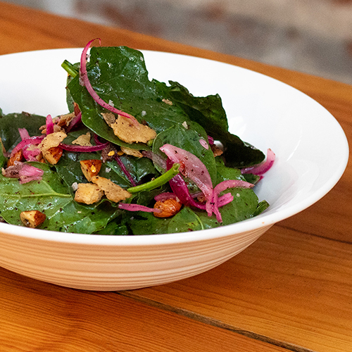 Espinaca baby, almendra, dátiles, cebolla encurtida, sumac y pan pita.