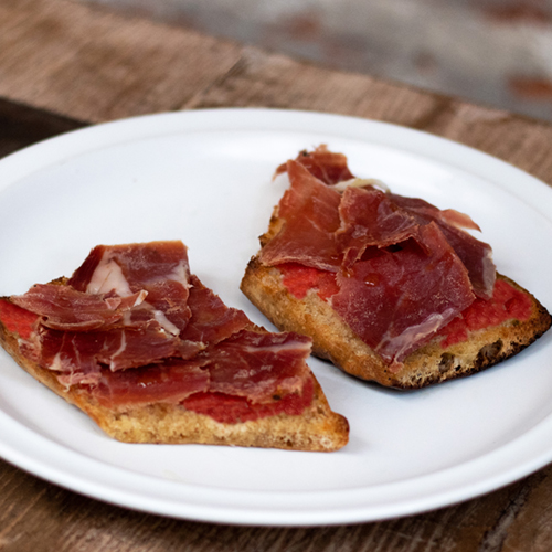 Rebanadas de pan rústico con tomate untado, aceite de oliva, ajo y jamón serrano.