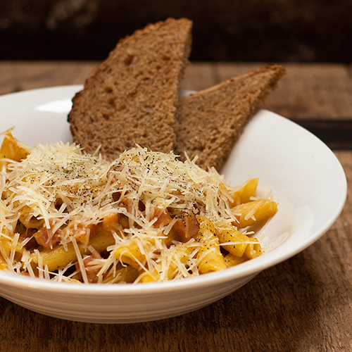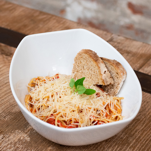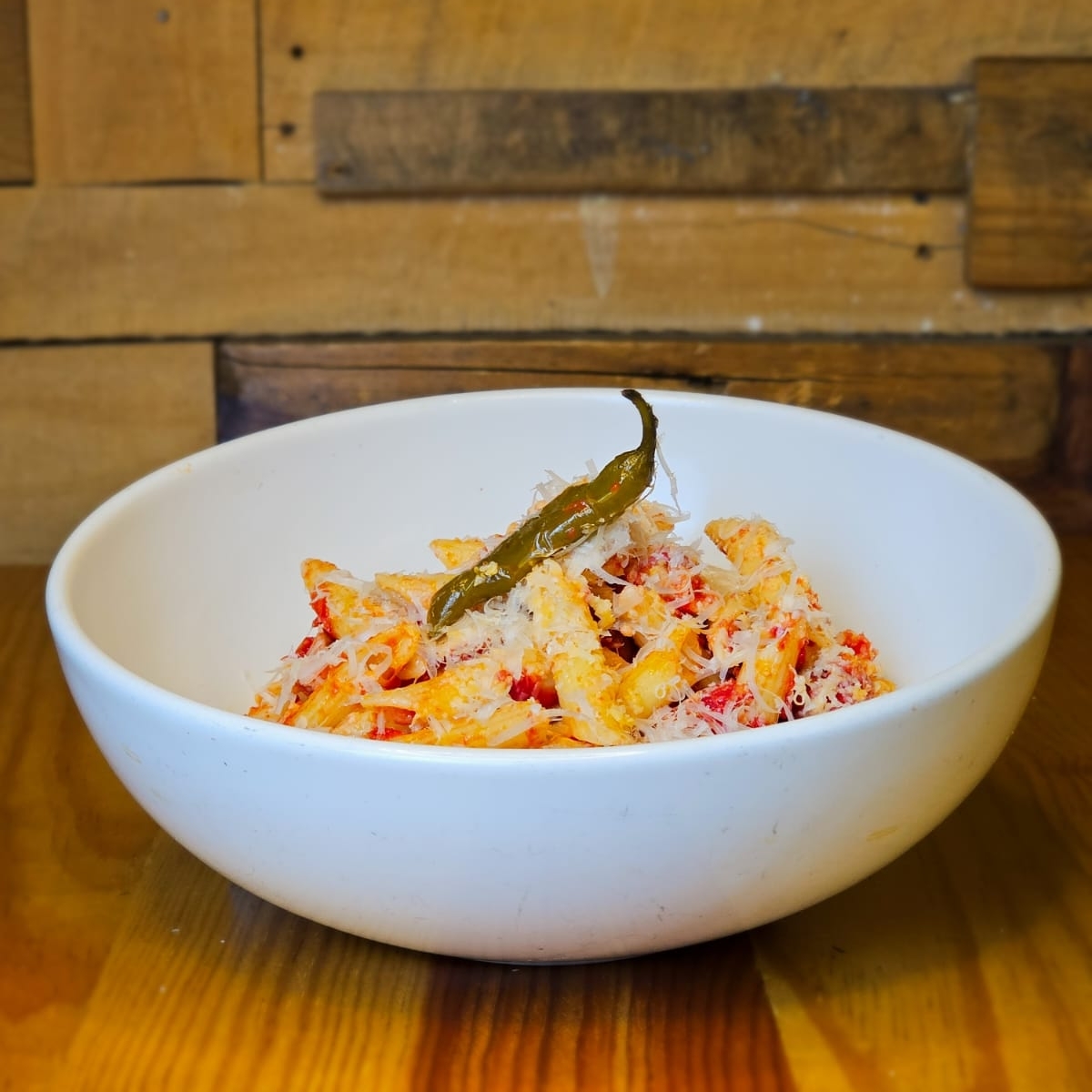 Pasta penne rigate con jitomates cherrys, albahaca, chile seco y parmesano.
