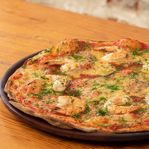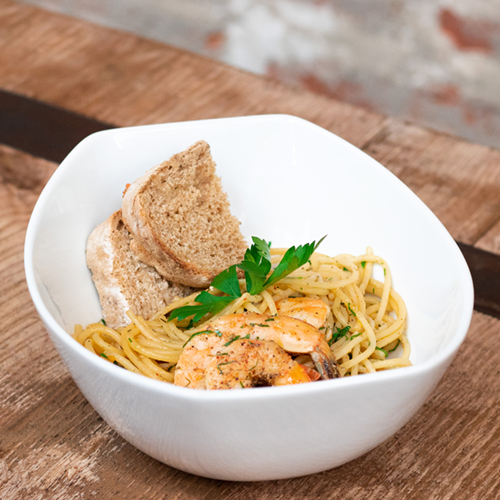 Pasta tagliatelle con camarones, toque de chile de árbol, eneldo, ajo y perejil.