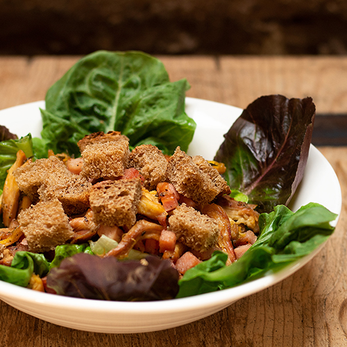 Pollo horneado al romero, acompañado de lechugas romanas, tocino, crotones y aderezo césar.