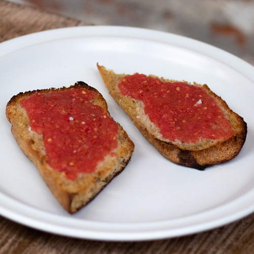 Rebanada de pan rústico con tomate untado, aceite de oliva, ajo y sal.