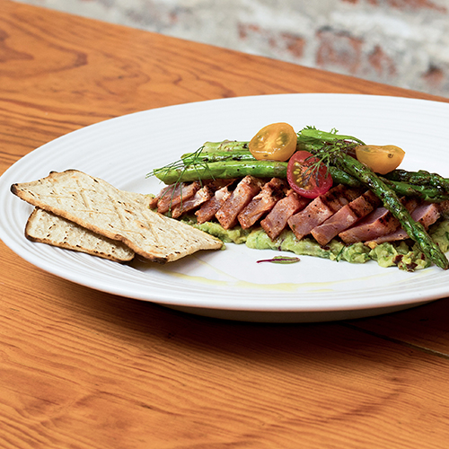 Atún sellado a la parrilla con aguacate martajado, chile seco y espárragos, 170 g.