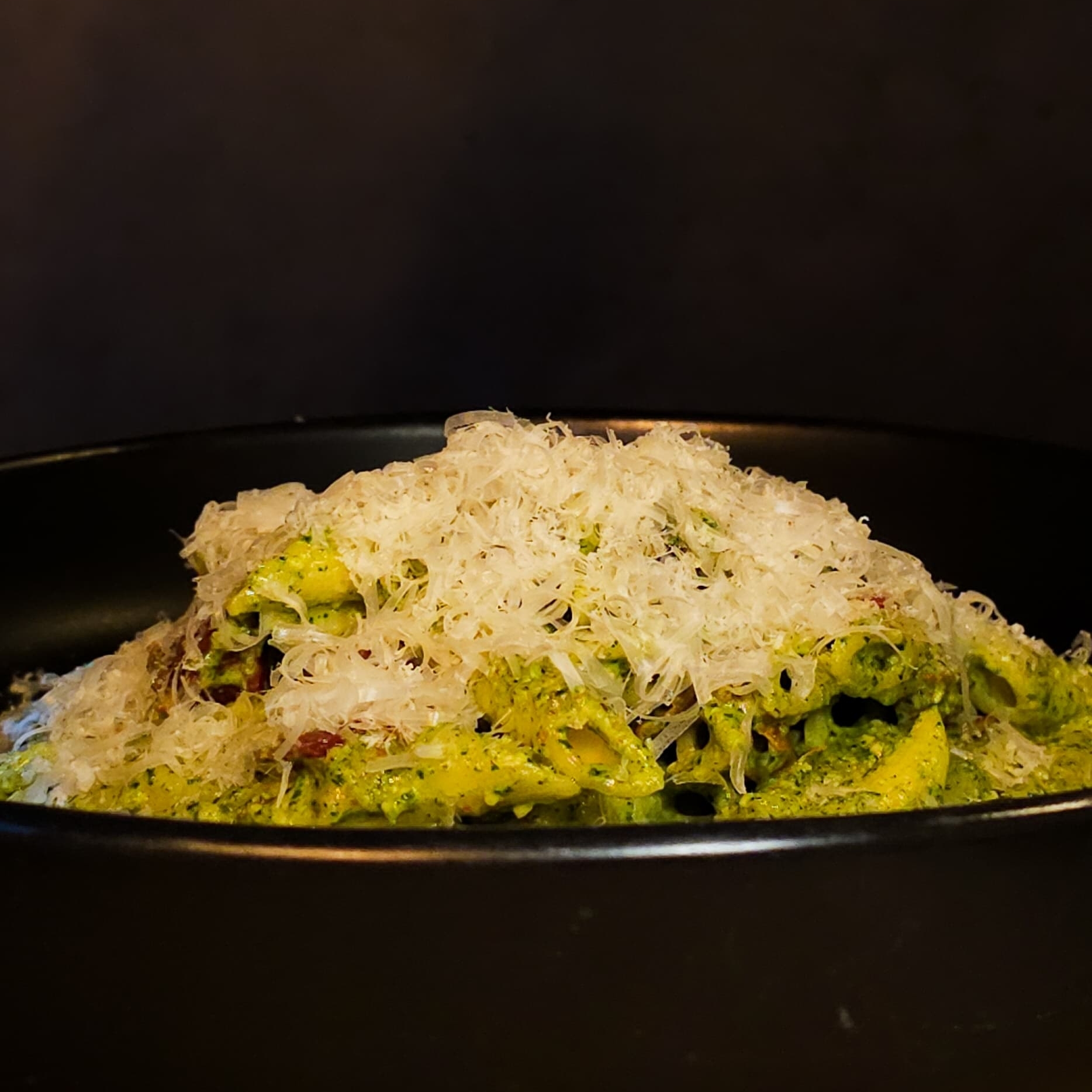 Espagueti con pesto, aceitunas negras y jitomate deshidratado.