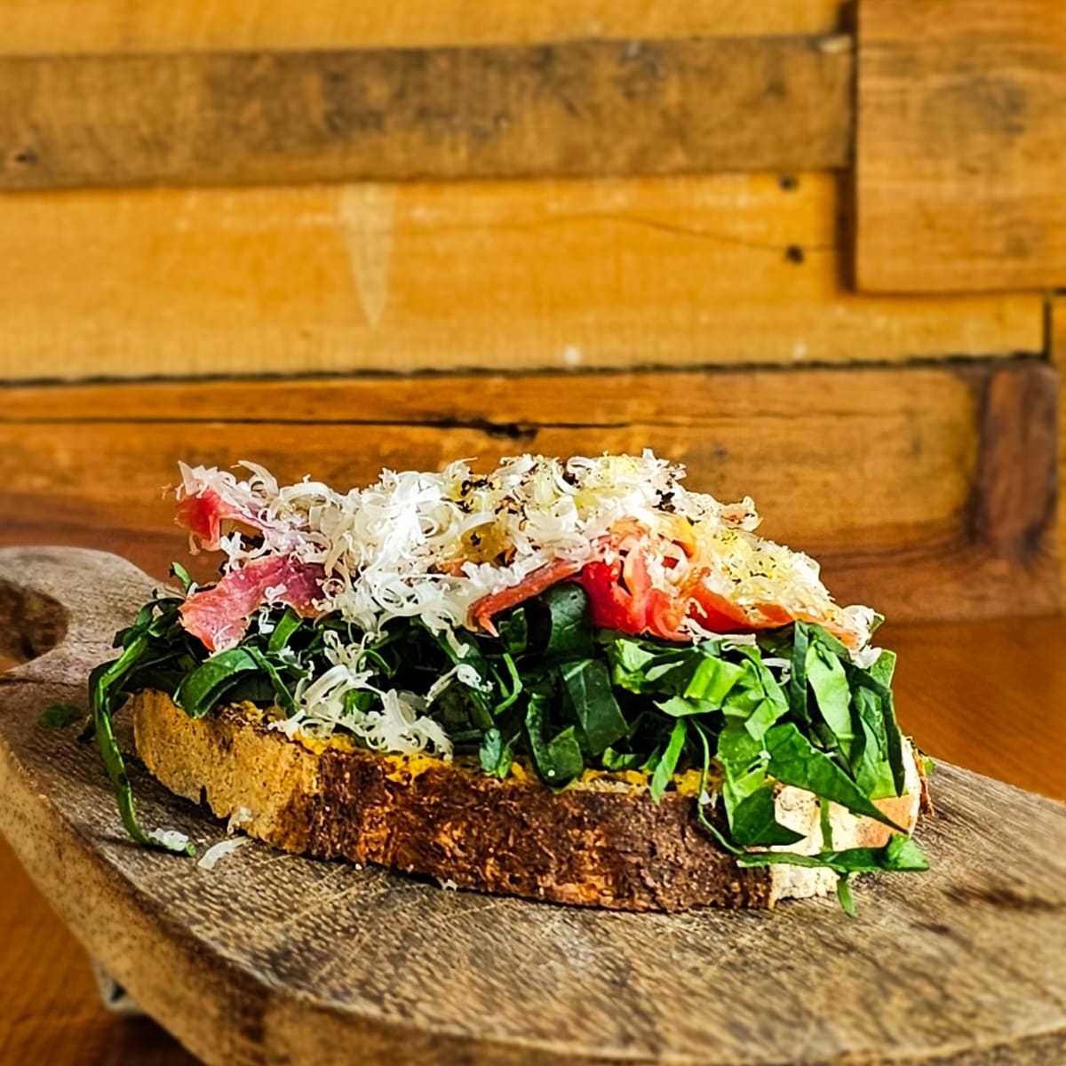 Jamón serrano, parmesano, espinaca en juliana, sobre pan de la casa.