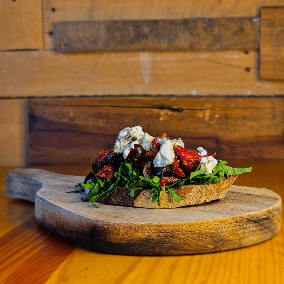 Cabra fresco, jitomate deshidratado y aceitunas negras.