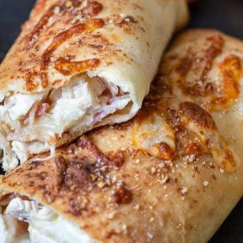 Rollo horneado, relleno con tiras de carne de pechuga de pollo, queso mozzarella, tocino ahumado.