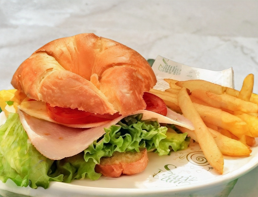 Sandwich de jamon con queso gratinado, lechuga fresca, jitomate y cebolla, acompañado de papas a la francesa