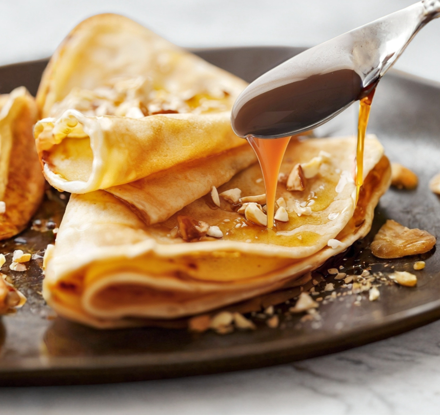 Deliciosa crepa con masa receta de la cafetería hecha al momento, con Cajeta, Adornada y con nuez triturada y/o semilla garapiñada.