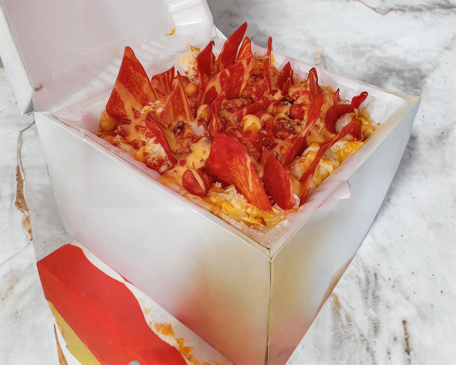 Sopa Maruchan con esquites, mayonesa, queso, limón, chile y toppings.