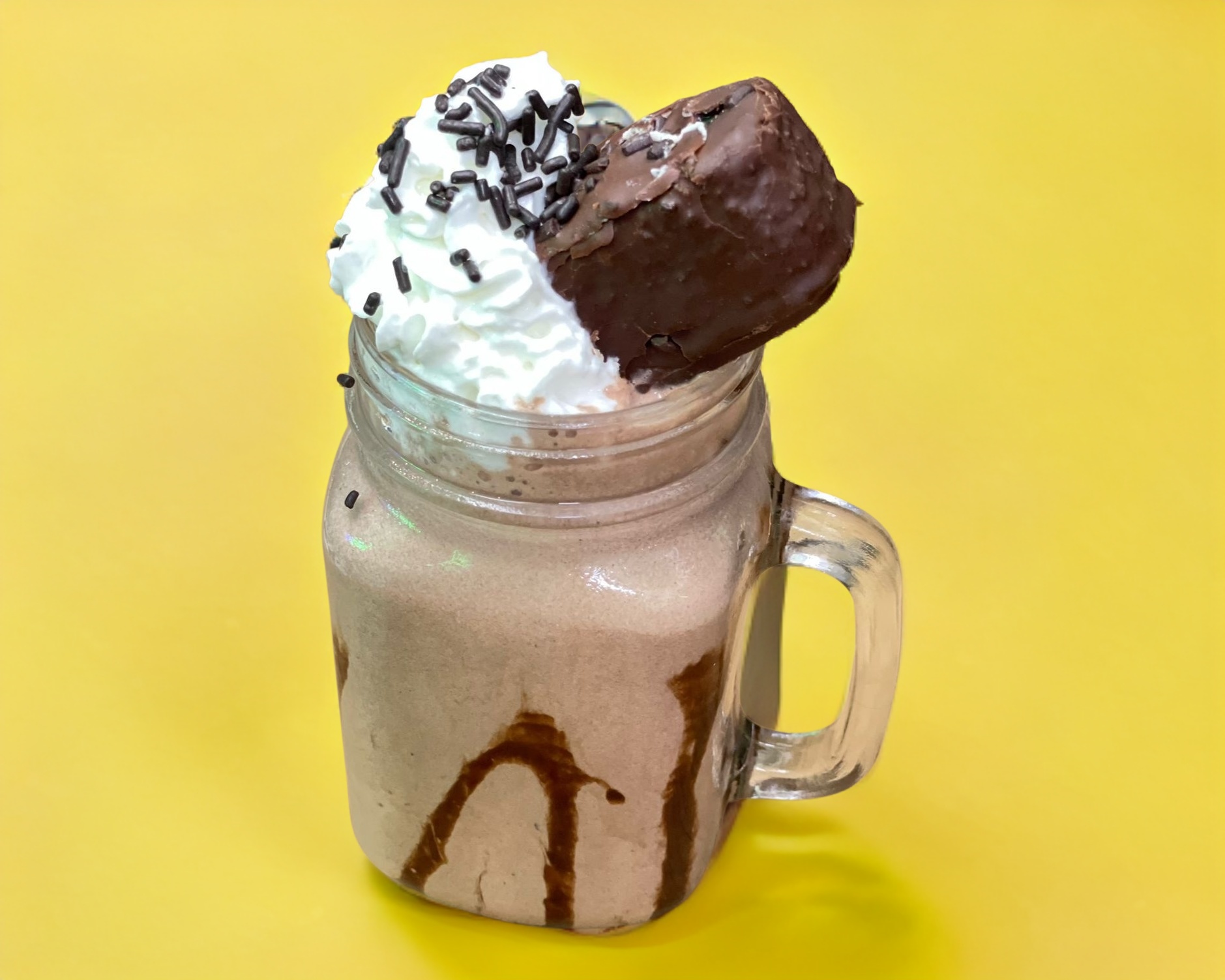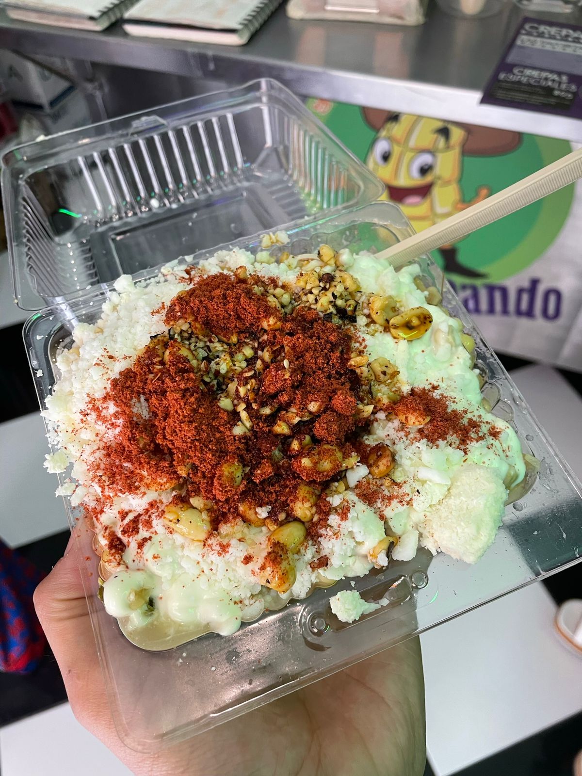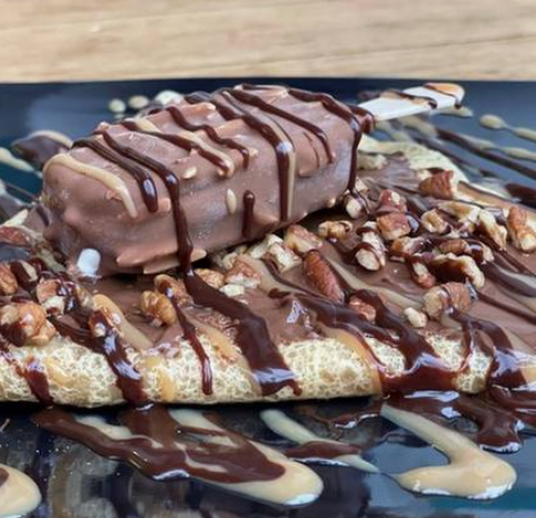 Crepa elaborada con Nutella, plátano, cajeta, nuez, queso philadelphia y una paleta Magnum.