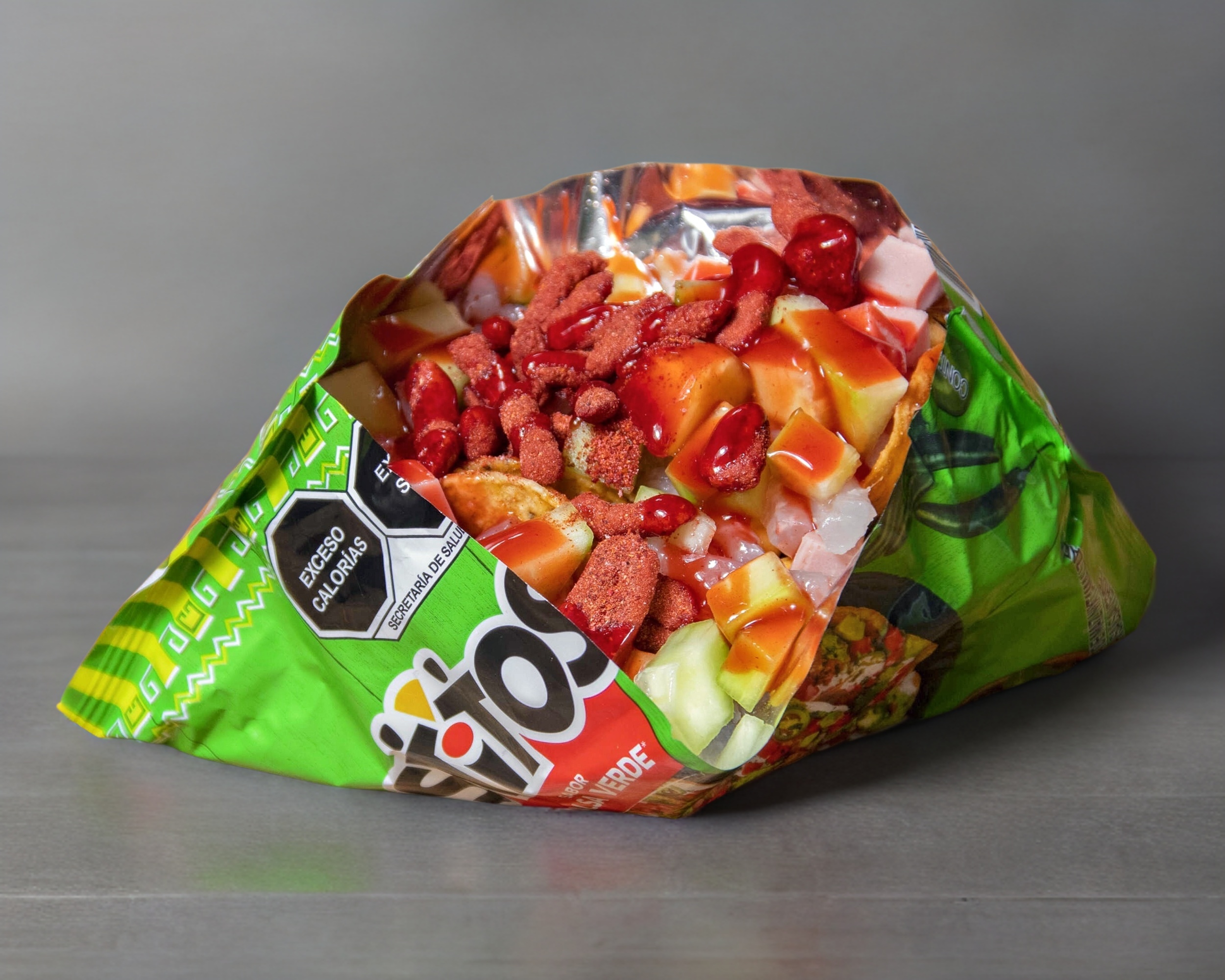 Cacahuate, pepino, salchicha, gomitas, clamato, chamoy, cueritos, salsa y fritura a elegir.