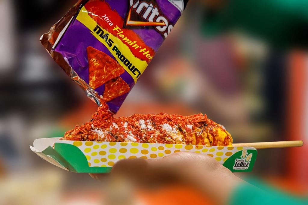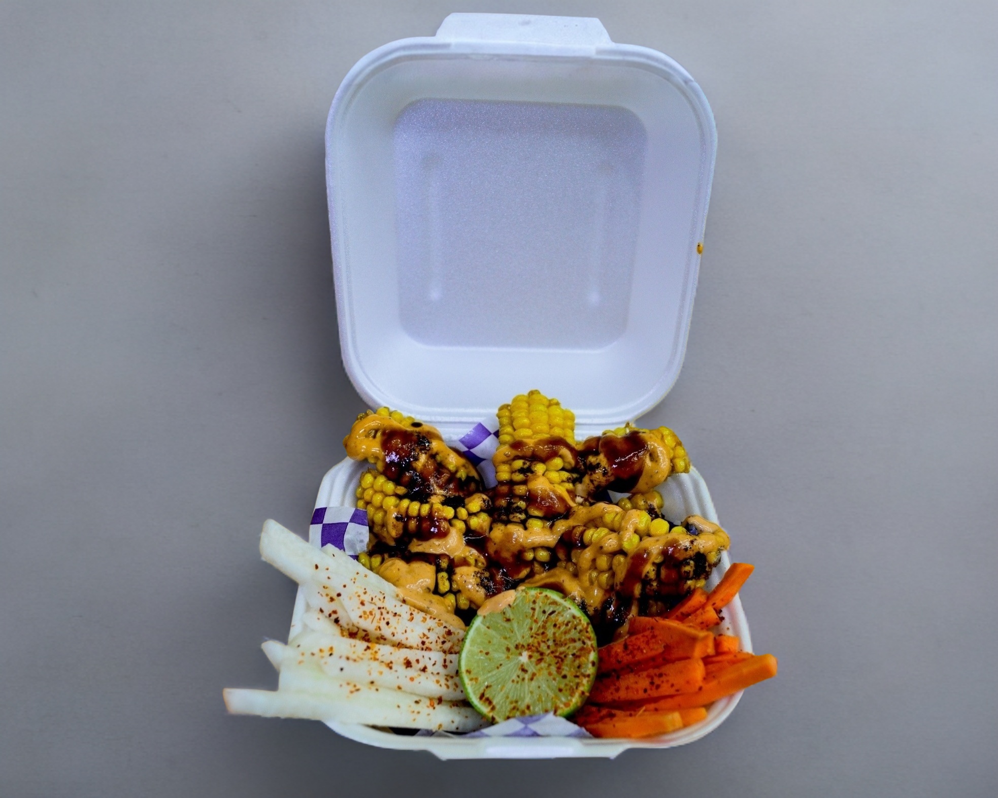 Deliciosas tiras de Elote dulce freídas y aderezadas con Mayonesa de Chipotle, salsa BBQ, receta nuestra, Crema de Tocino y acompañadas por unas tiras de Zanahoria y Jícama frescas