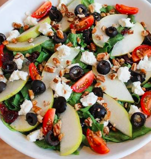 Mezcla de lechuga y arúgula, queso de cabra, pera, nuez, arándano, tomate cherry, aceituna negra.