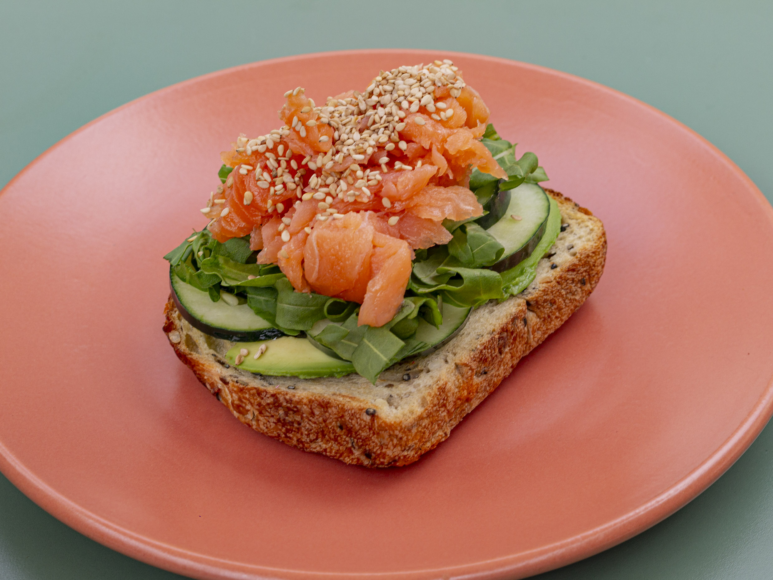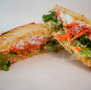 Pan de caja, queso bousin, salmón ahumado, aguacate, rodajas de pepino, alcaparras, ajonjolí tostado y berros.