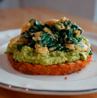 Pan de caja, guacamole y huevo revuelto con espinaca.