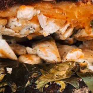 Pan de caja, bechamel de tomate y chipotle, aguacate, pollo asado, espinaca y queso chihuahua.