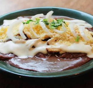 Aguacate, chilaquiles verdes o rojos, queso cotija, crema, cebolla y cilantro. Elige si de huevo o pollo.