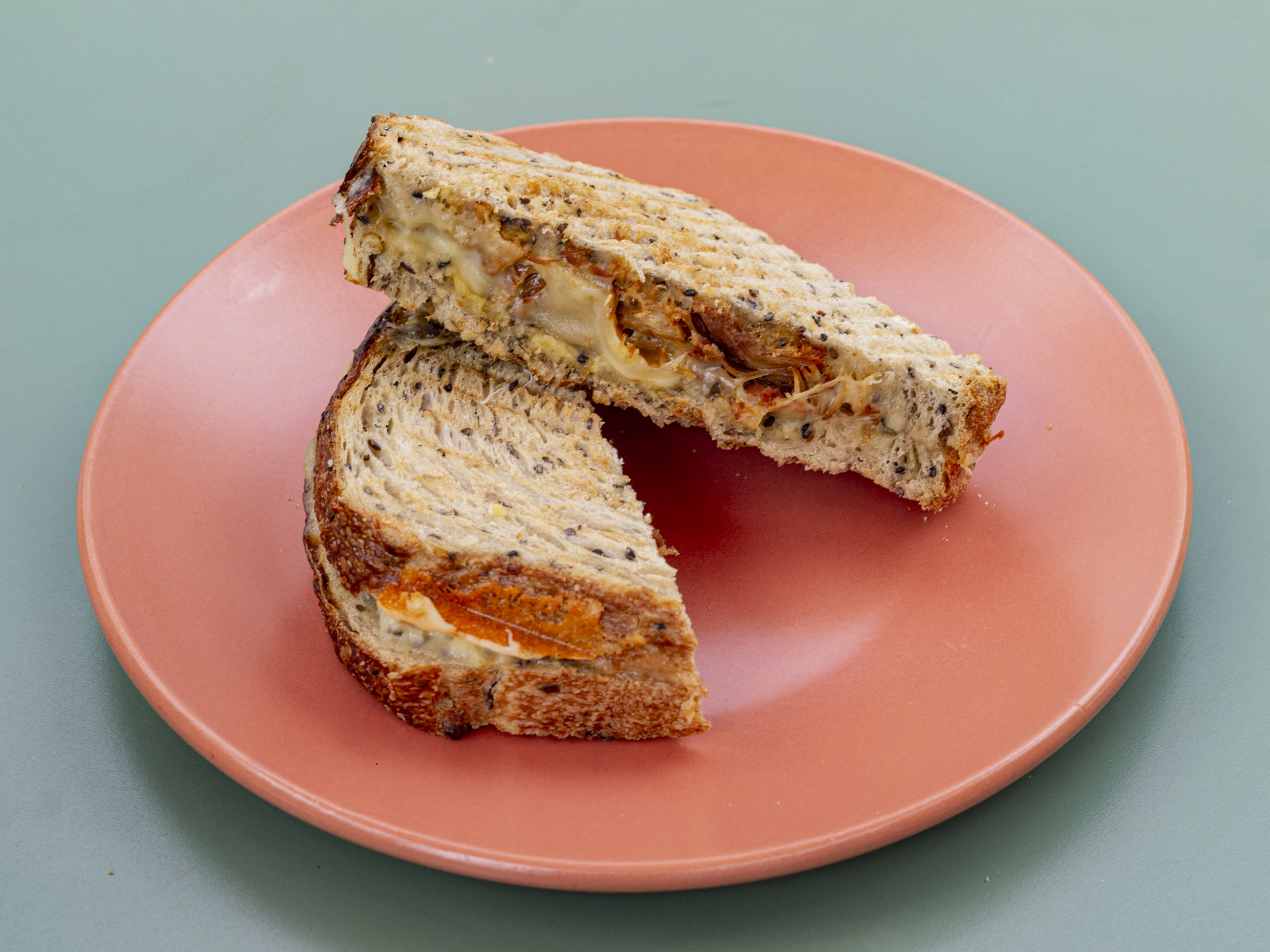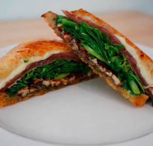 Pan de caja, pesto original, tomate deshidratado, arúgula, jamón serrano, queso chihuahua y nuez.