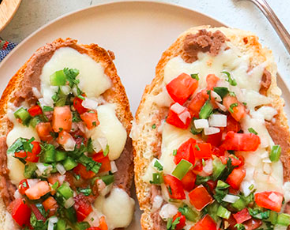 Pan de caja, frijoles refritos y queso chihuahua fundido, acompañado de pico de gallo.