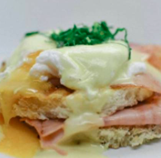 2 Huevos ponchados sobre pan de caja, jamón york, aguacate, espinaca y salsa holandesa.