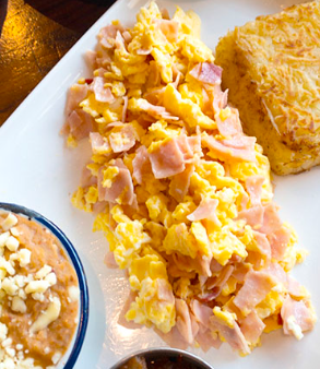 Con jamón, tocino a la mexicana, acompañados de frijoles refritos o aguacate con espinaca.
