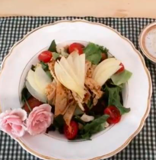 Mezcla de lechuga y espinaca, tomate cherry, arándanos, almendras, nuez de la india, pollo asado, manzana, aderezo de miel y mostaza.