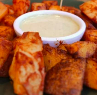 Papas salteadas con paprika, sal y limón. A compañadas de aderezo de chile cuaresmeño.
