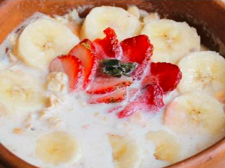Mix de avena con leche de almendras, topping de plátano y fresa.