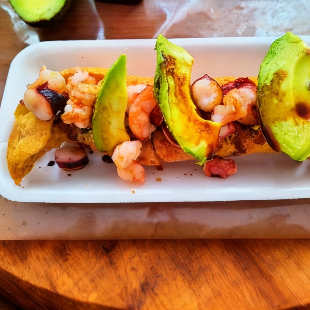 Rico filete de buen tamaño con camarón, pulpo y aguacate