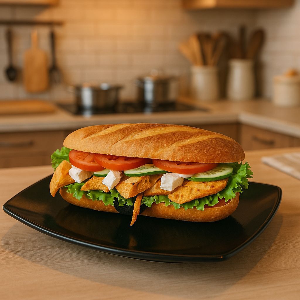 Exquisita barra premium; pan masa madre. Rellena de pollo, queso panela y vegetales con rajas.