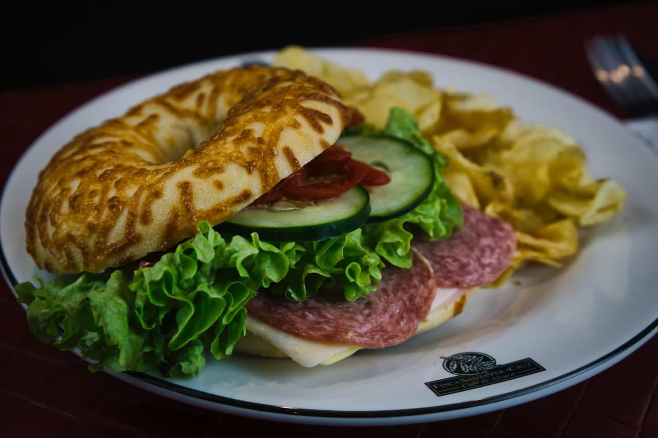 Bagel de pechuga de pavo, queso manchego, lechuga, jitomate y una porción de papas.