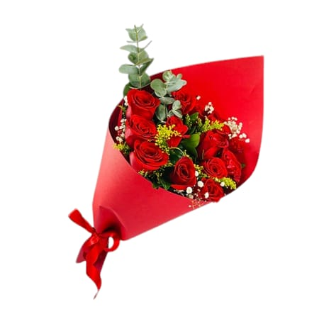 HERMOSO RAMO DE 12 ROSAS ROJAS ACOMPAÑADO DE FOLLAJE Y ENVUELTO CON PAPEL DECORATIVO