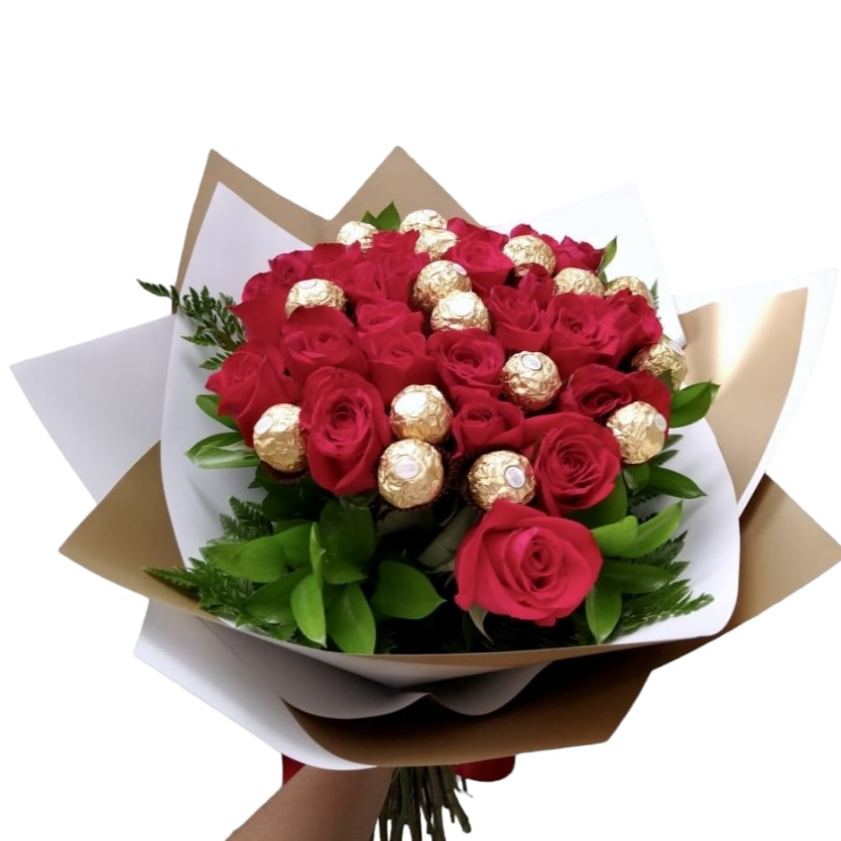 HERMOSO RAMO DE 24 ROSAS ROJAS CON 16 PIEZAS DE CHOCOLARES FERRERO ROCHER