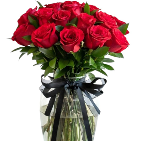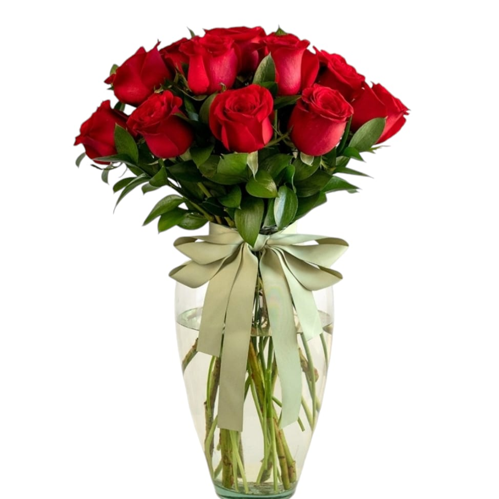 FLORERO DE 12 ROSAS ROJAS DE INVERNADEROCON FOLLAJE Y CINTA DECORATIVA