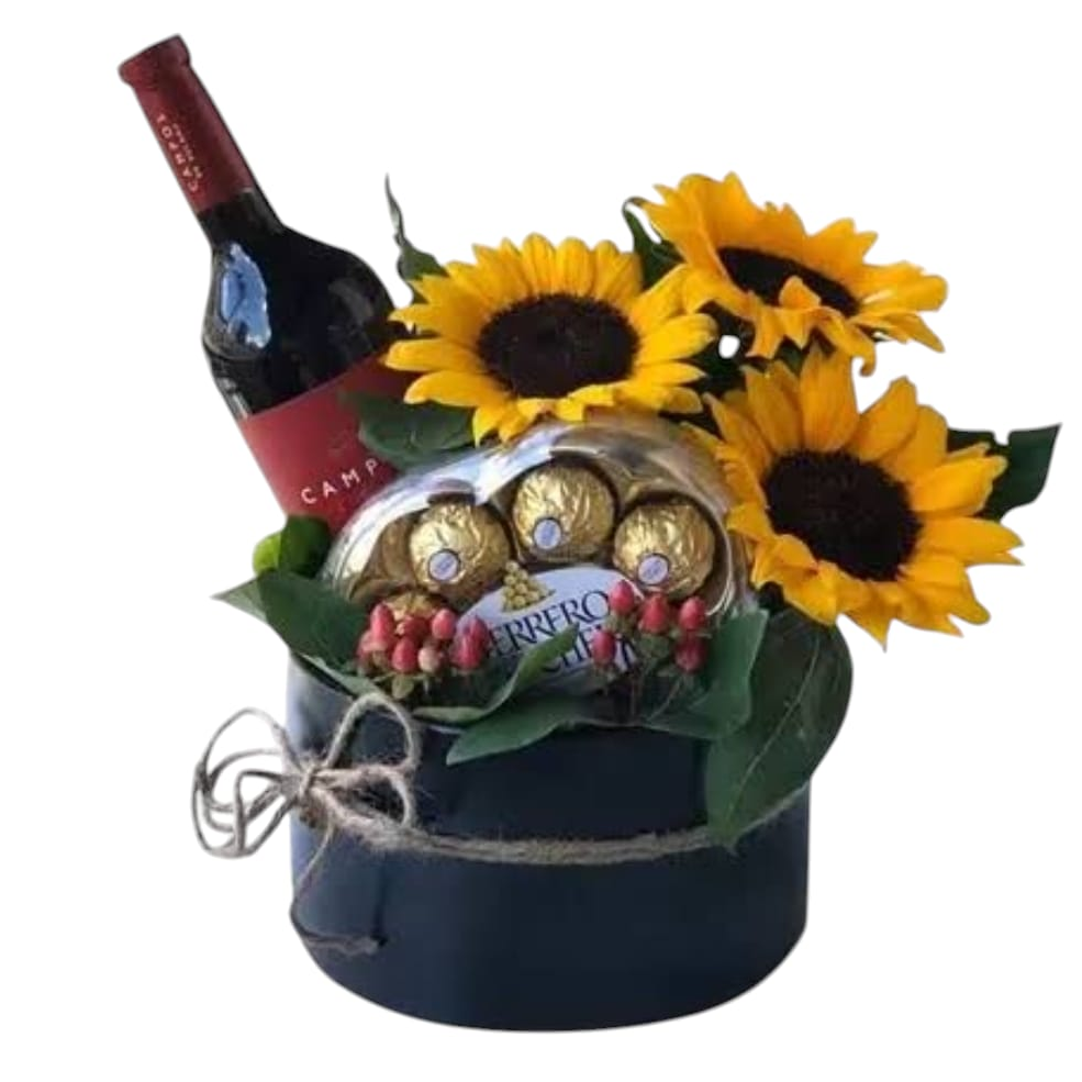 CAJA DE GIRASOLES ,CHOCOLATES FERRERO ROCHER Y VINO TINTO