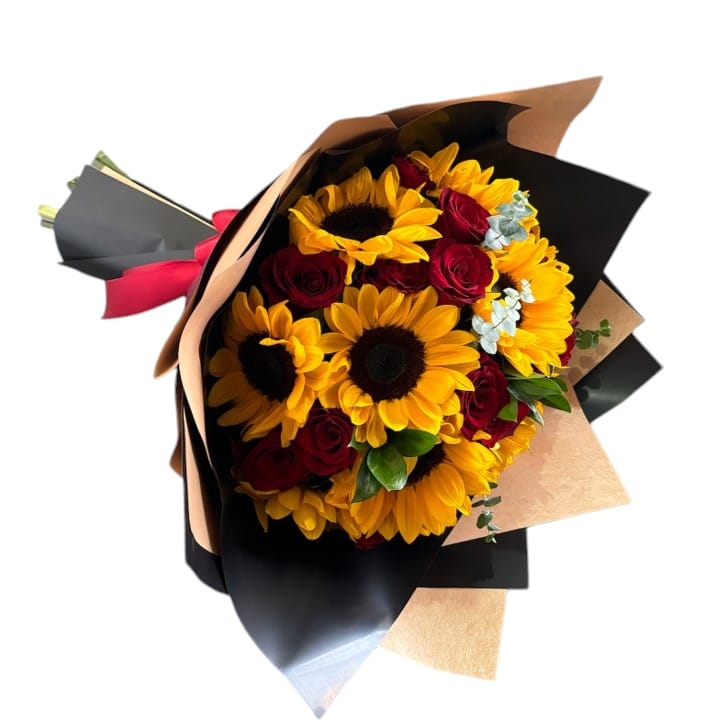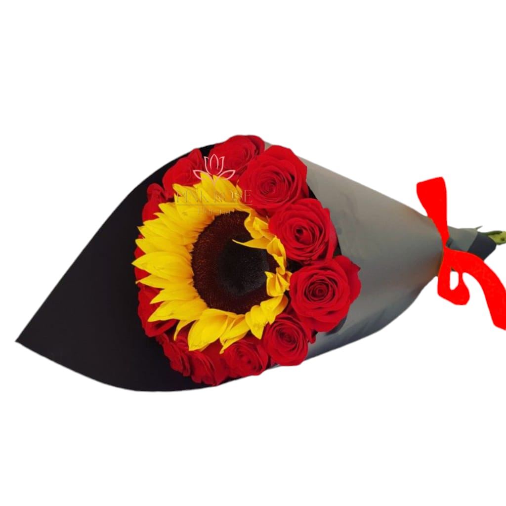 RAMO COMPUESTO DE 10 GIRASOLES Y 12 ROSAS ROJAS ENVUELTAS CON PAPEL DECORATIVO