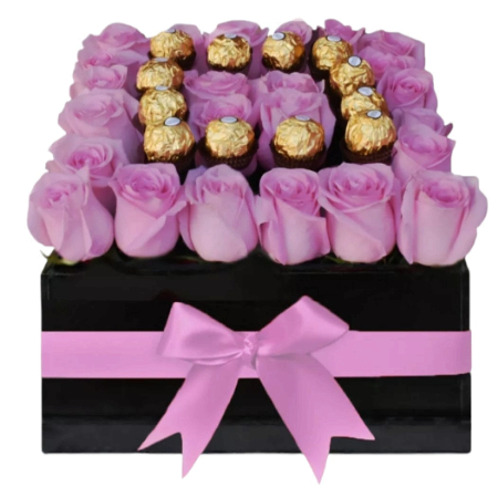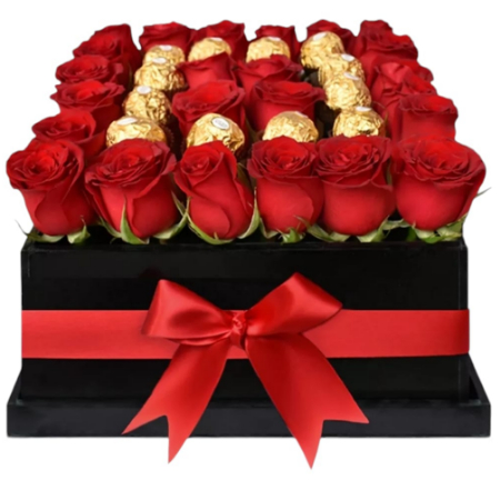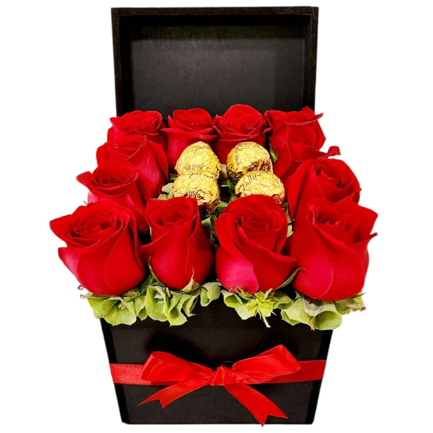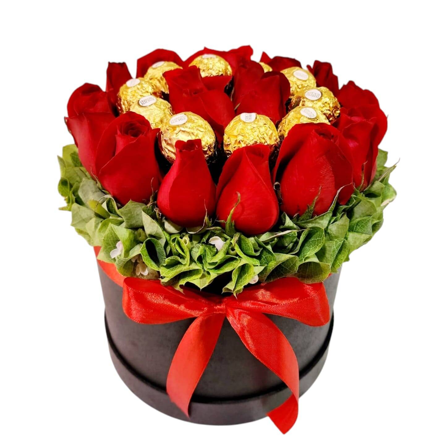 BONITA CAJA DE ROSAS ROJAS Y CHOCOLATES FERRERO ROCHER