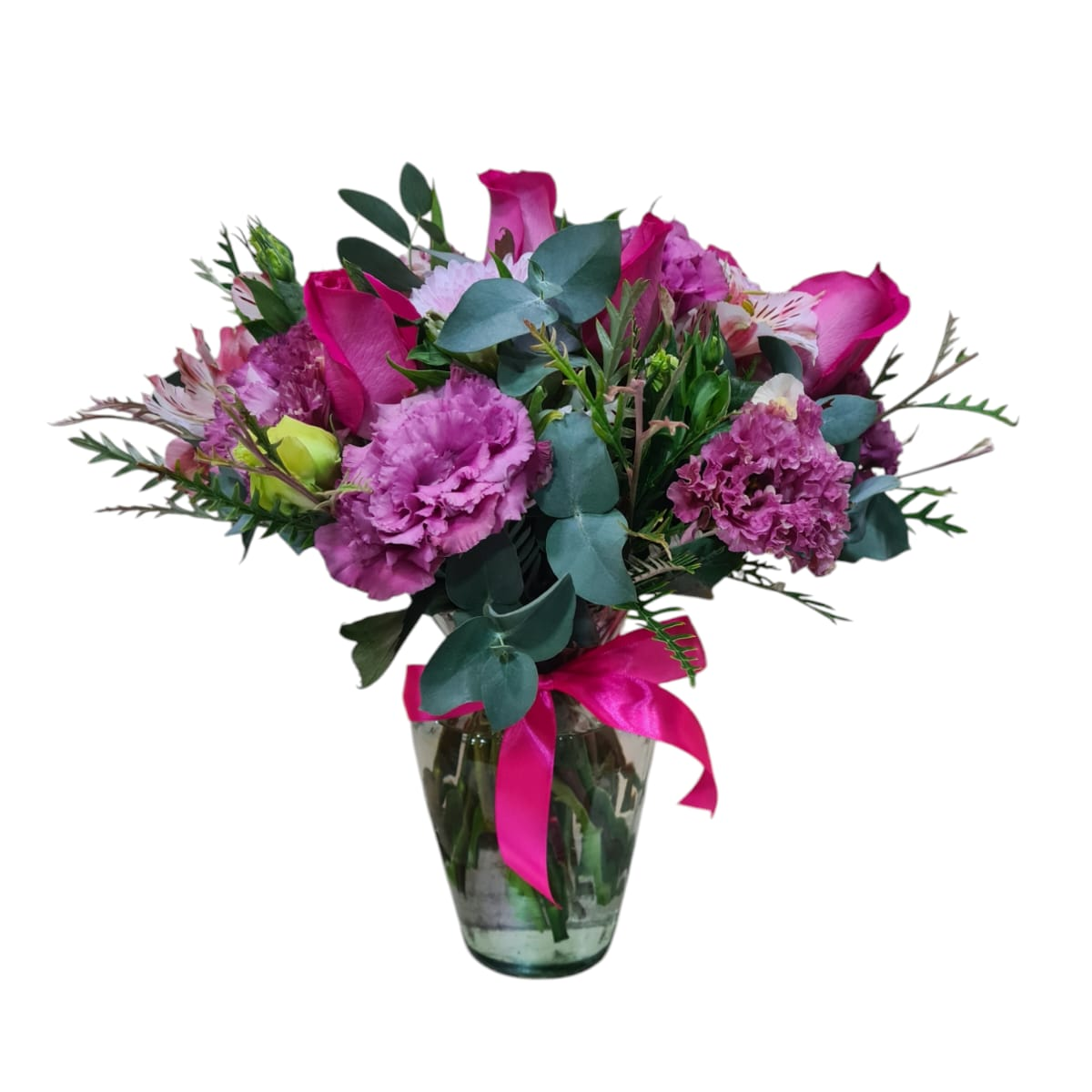 HERMOSO FLORERO DE CRISTAL CON 6 ROSAS ROSAS DE INVERNADERO Y HERMOSOS LISIANTUS CON FLORES Y FOLLAJES DE ESTACION