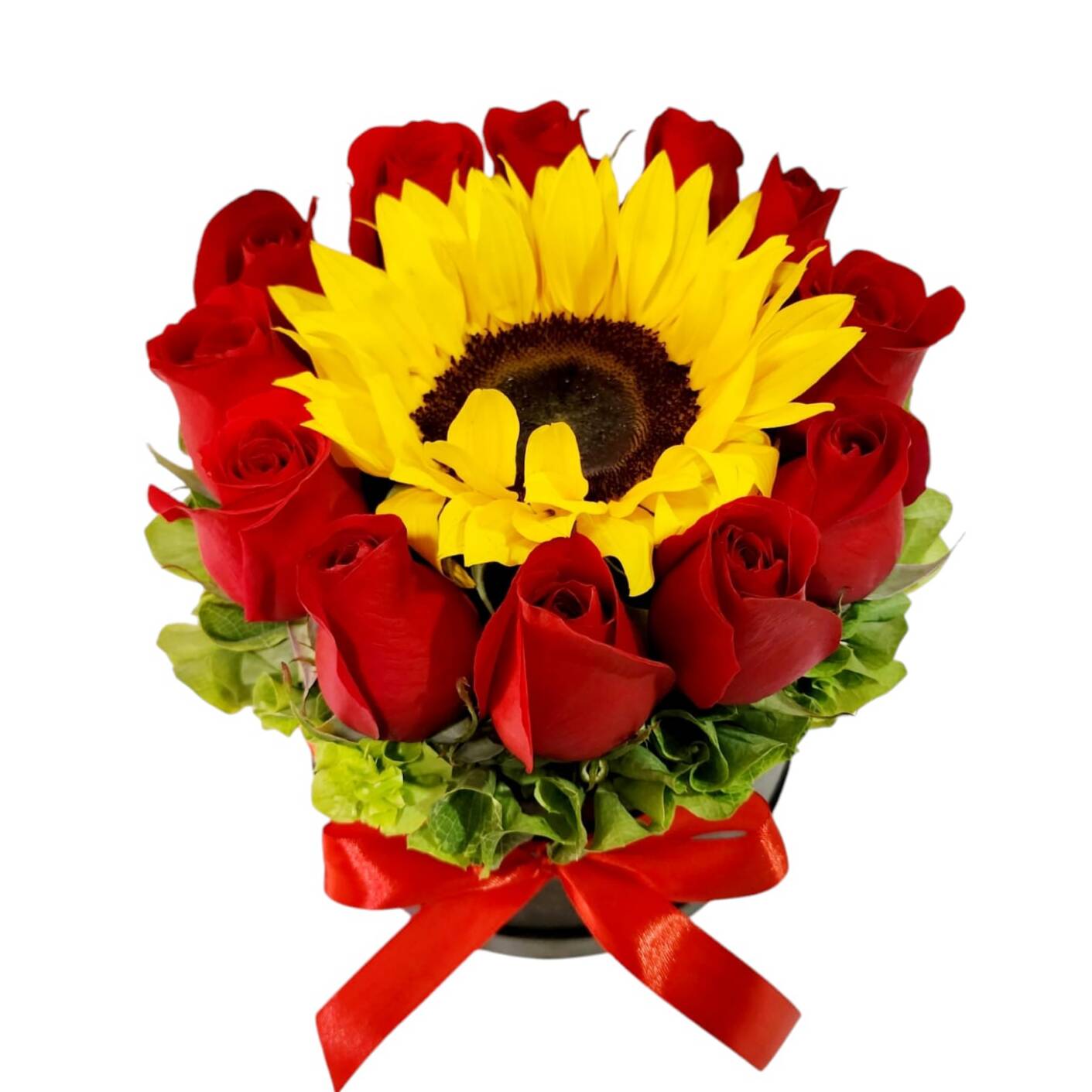 CAJA DE 12 ROSAS ROJAS DE INVERNADERO Y 1 GIRASOL EN EL CENTRO