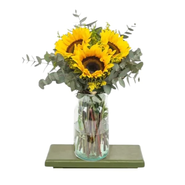 JARRON DE VIDRIO COMPUESTO POR 3 GIRASOLES Y EUCALIPTO.
