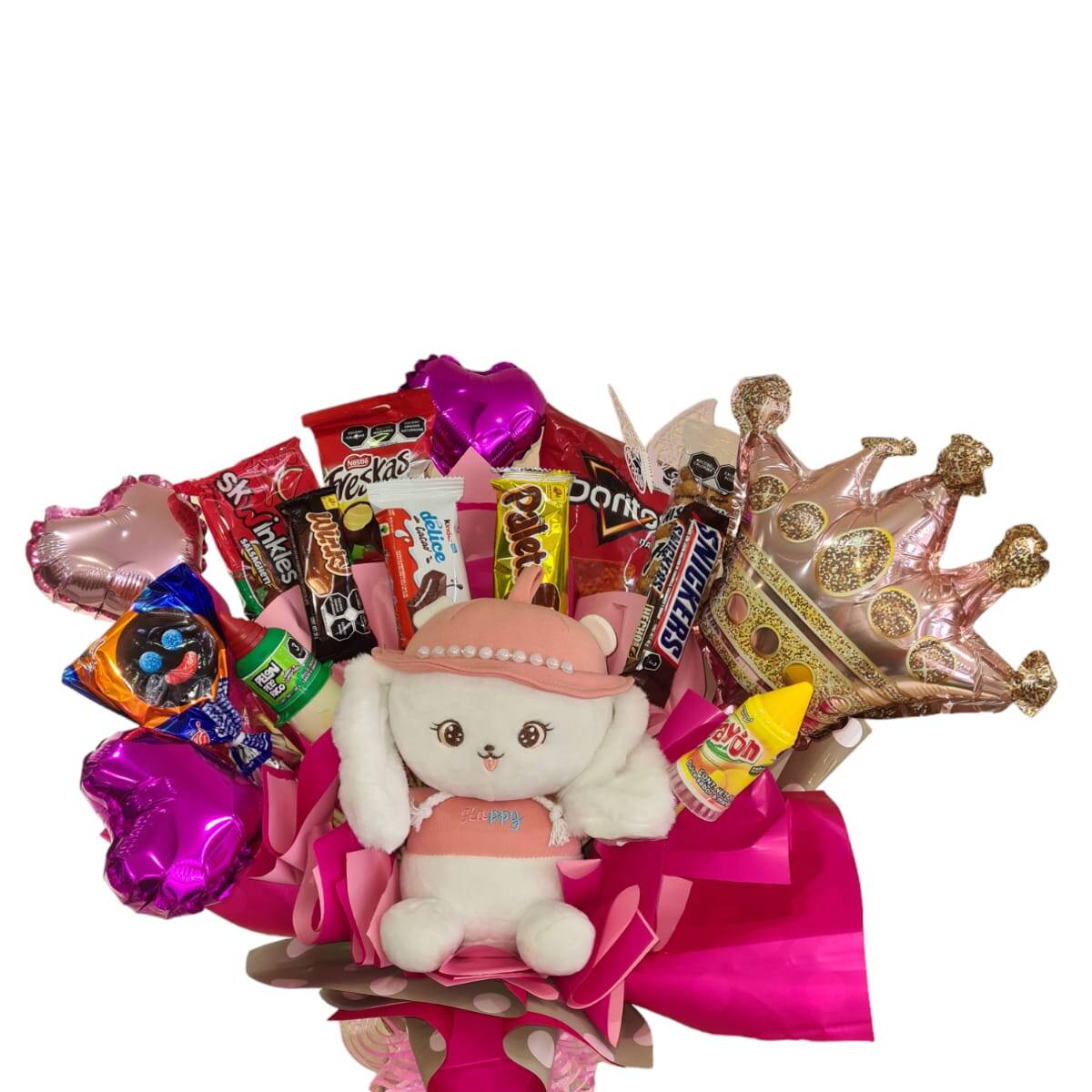 BELLISIMO ARREGLO DE DULCES VARIADOS CON PELUCHE Y GLOBOS DECORATIVOS (PELUCHE Y GLOBOS DEACUERDO A EXISTENCIA)