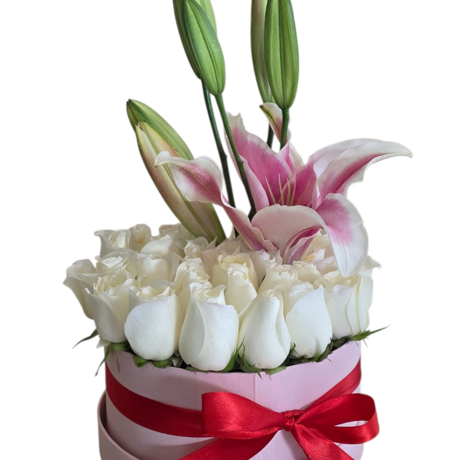 CAJA DE MADERA CON ROSAS BLANCAS Y TULIPANES HOLANDESES