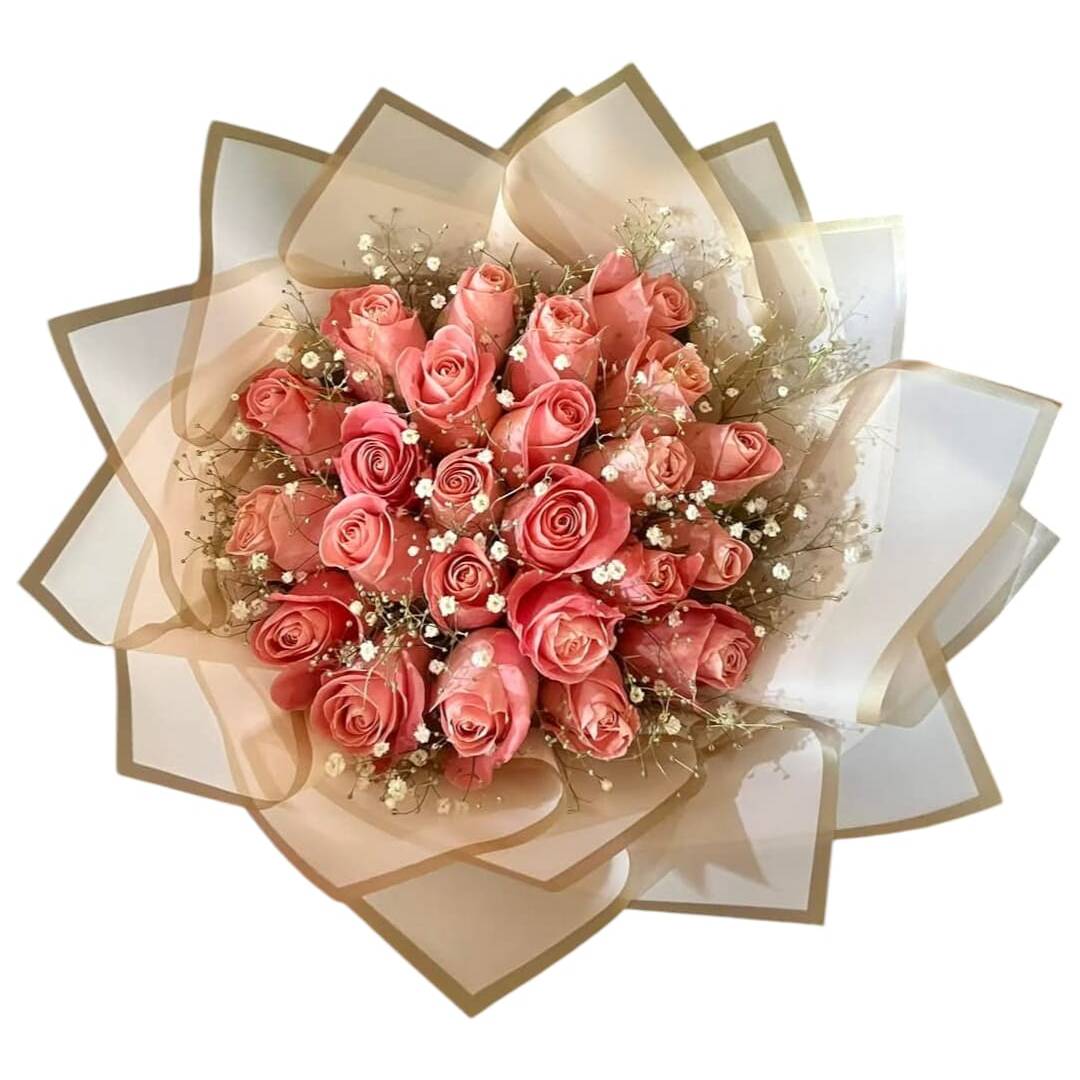 BOUQUET DE 24 ROSAS ROSAS CON GIPSHOFILA ENVUELTAS CON PAPEL DECORATIVO.