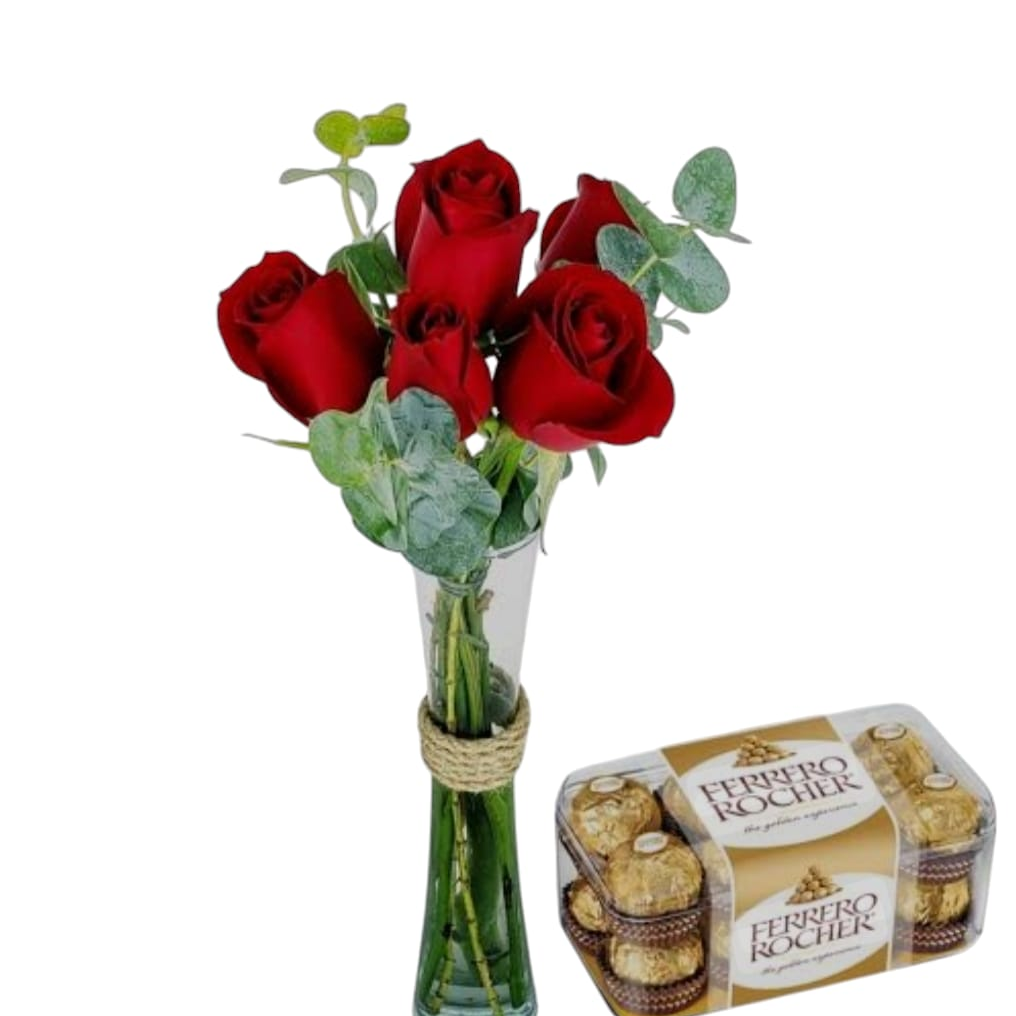 FLORERO DE VIDRIO CON 5 ROSAS ROJAS DE INVERNADERO Y EUCALIPTO CON CHOCOLATES FERRERO ROCHER DE 16 PIEZAS