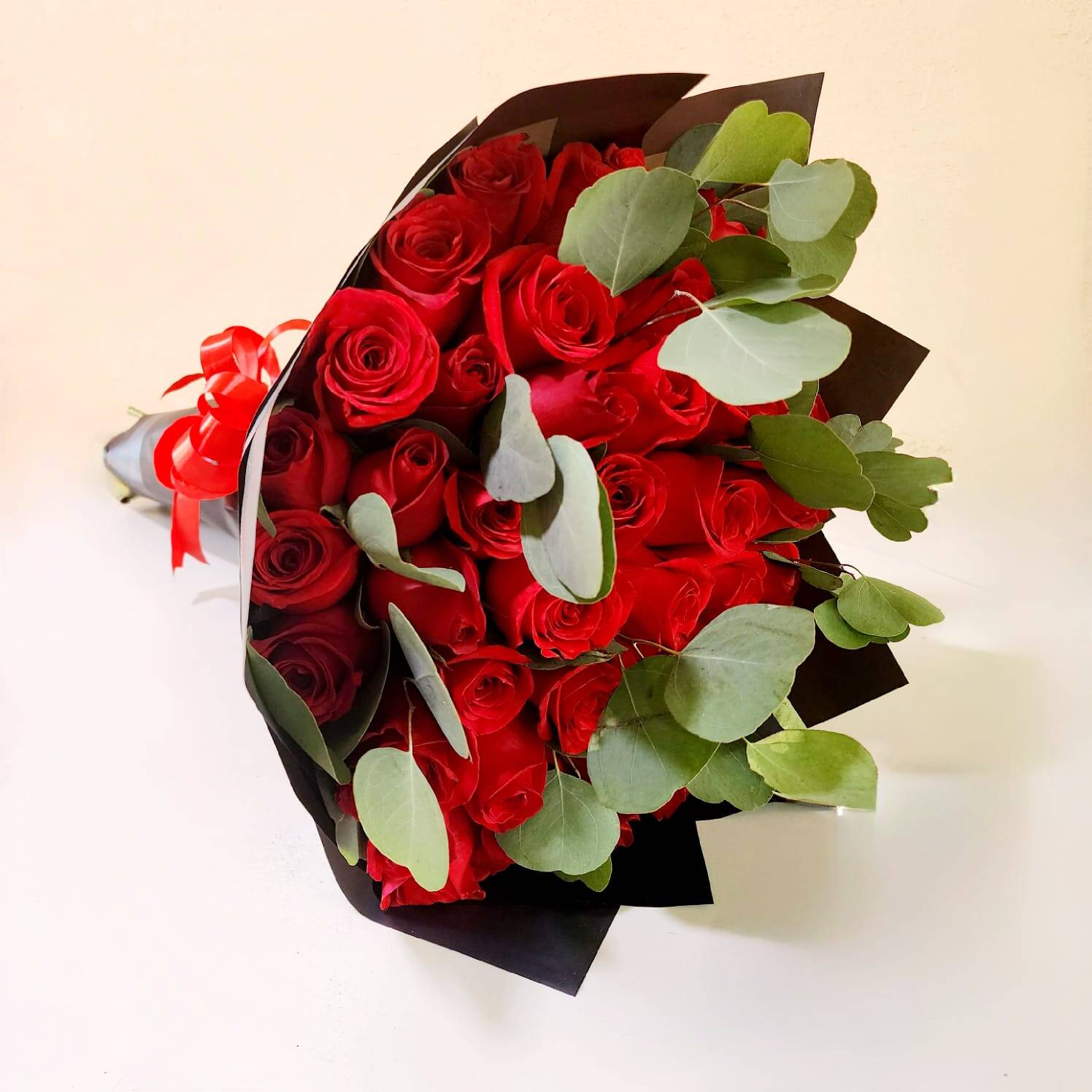 FLORERO DE 24 ROSAS ROJAS DE INVERNADERO CON FOLLAJE Y CINTA DECORATIVA