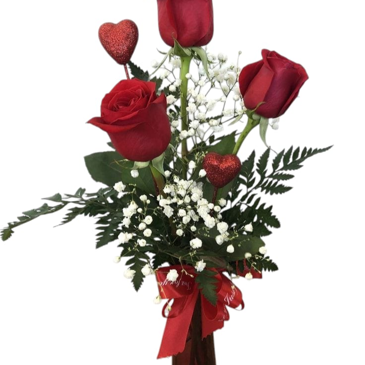 FLORERO DE CRISTAL CON 3 ROSAS DE INVERNADER Y FINO FOLLAJE