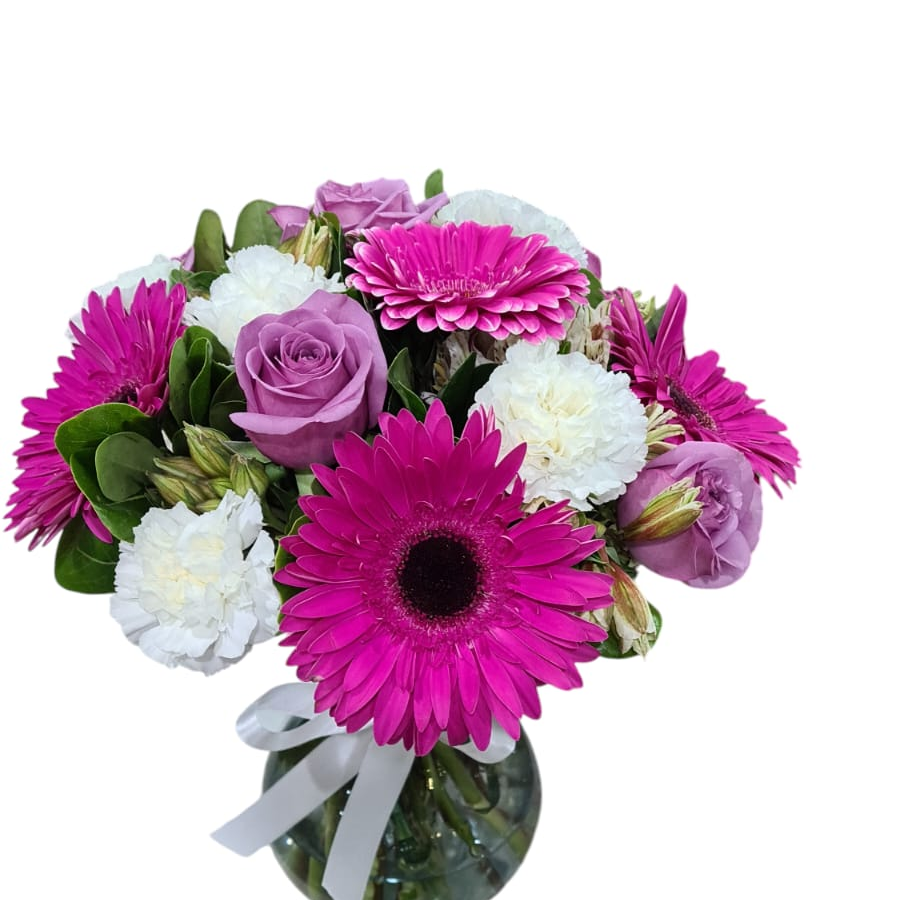FLORERO COMPUESTO POR GERBERAS ROSAS, MARGARITAS Y LISTON DECORATIVO.