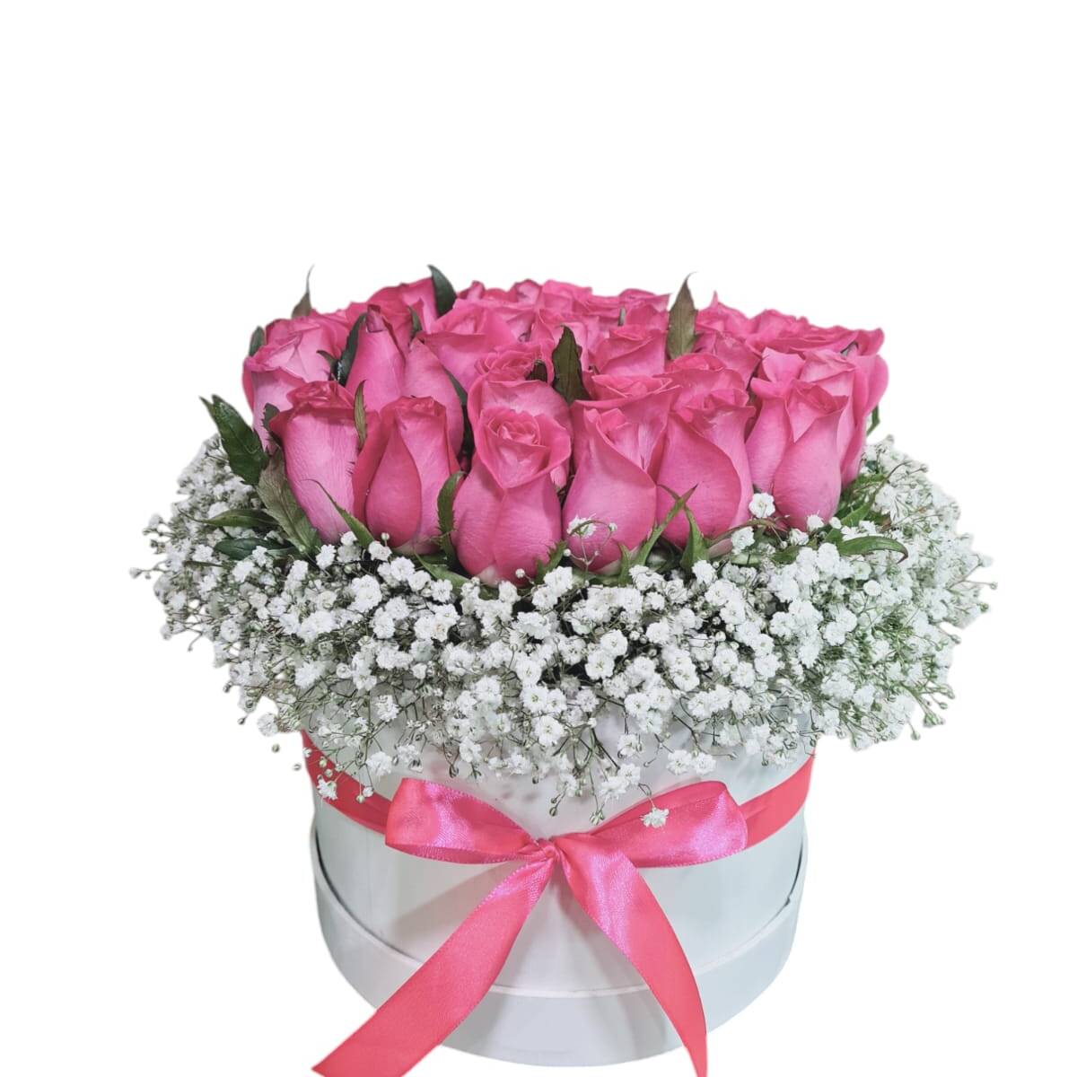 CAJA DE MADERA COMPUESTA POR 24 ROSAS ROSADAS Y GIPSOPHILIA CON LISTON DECORATIVO